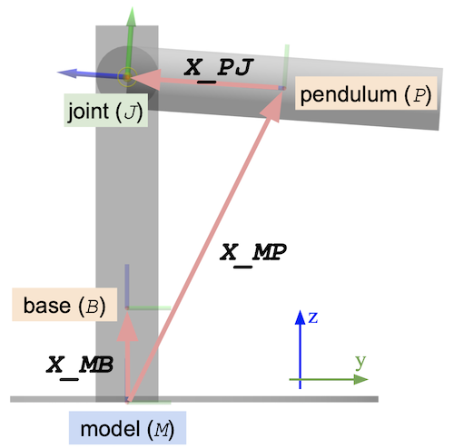 SDFormat 1.6 and earlier have fixed rules for each type of element to determine the frame in which a pose is specified. For example, all link poses are specified relative to the model frame. This is illustrated for the pendulum with base model in SDFormat 1.6 format.