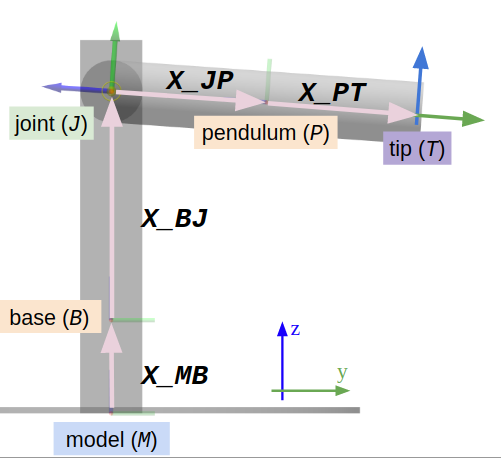 For the pendulum with base illustrated above, a frame named tip is attached to the pendulum link at its farthest end by specifying the link's name in the @attached_to attribute and expressing its pose relative-to the pendulum link frame. A visual in the pendulum link is created whose pose is relative-to the tip frame. Note that in SDFormat 1.7, an empty //pose is treated as an identity, so specifying <pose relative_to="tip"/> will co-locate an entity with the tip frame.